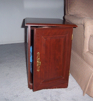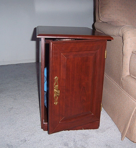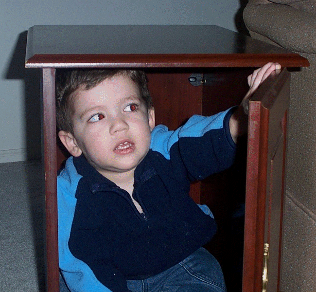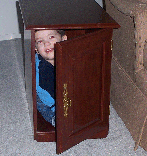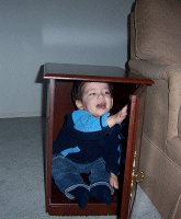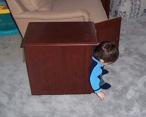 As I've outlined in the past few entries, our house is in a state of flux. We have furniture that we've acquired that we don't have settled just yet and we have junk to move from room to room so that we can have work done on the house. In these pictures, Bobby discovered that this end table is the perfect size to make a little house for him.