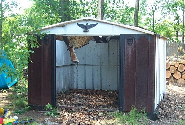 You can see that it is a piece of crap. A rusted, shell of its former self. We never saw its former self. It was like this when we moved in. I'm sure that it was a perfectly servicable shed in its day. But now that eagle on the front just mocks me, daring me to take the shed down. It has become such an eyesore. Moreso after a heavy storm last year blew a tree right through the roof. It didn't just blow the tree onto the shed. The tree was right behind the shed and when the wind came it broke the tree off in the middle and the top half fell straight down and the jagged broken part pierced the roof of the shed. When the tree guys came last week, they cut and removed the tree from the shed setting up the battle between me and the shed. The tree guys also said something else interesting. Even though we didn't use the shed, they said that it was still covered by our home owners insurance. So we took pictures of the shed and tree and will submit them to the insurance company. Maybe we can get a little something towards the new shed.