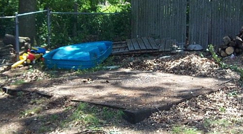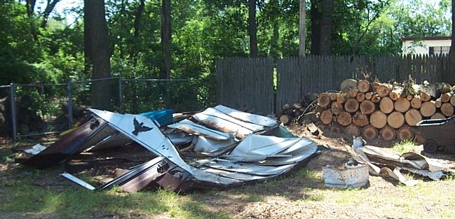 I looked a little closer and saw that the bottom of the walls were attached to four metal rails that had been nailed into the wooden base of the shed. But when I say attached, I mean a few atoms of the rusted walls might have still been touching the nuts and bolts of the rail. Especially on the right side of the shed. So I started kicking the bottom of that right wall inward. I was kicking like a child throwing a fit in the corner. The whole right side of the shed came free from the rail. I gave the whole shed a little nudge with my shoulder. Well, suddenly this shed was nearly as sturdy as it was before. I grabbed the edge of the roof on the left side and pulled with all my weight. The metal groaned as I the back right hand corner of the shed lifted of the ground. It took only two more pulls before I got the whole thing to collapse on its side.
